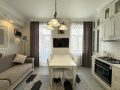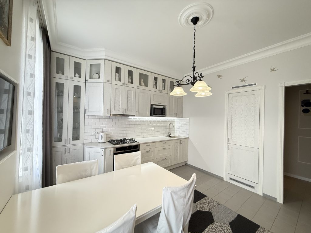 Интерьер выполнен в современном стиле с акцентом на качество и детали. Кухонная зона оснащена новой техникой, а изысканная столешница из камня подчёркивает статус и практичность пространства.