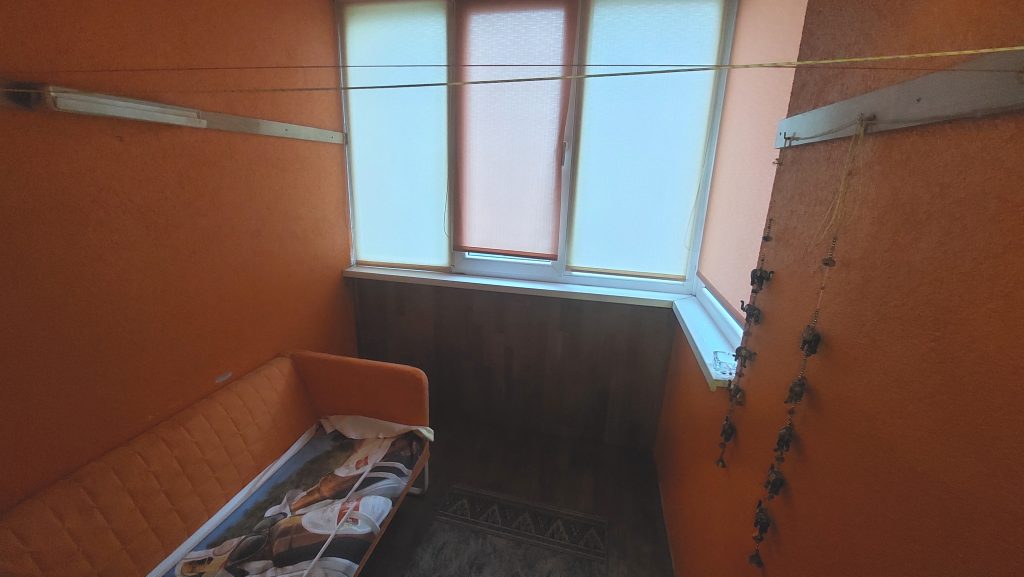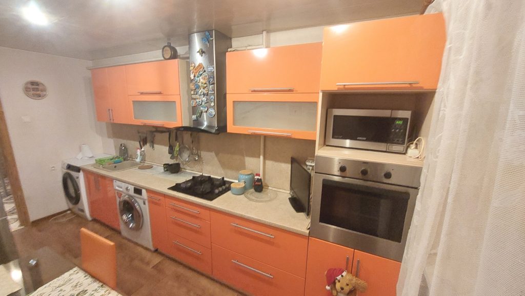 - в кухне: остается встроенный кухонный гарнитур, газовая встроенная поверхность, духовой шкаф, вытяжка, двухкамерный холодильник, стиральная машина, сушилка, микроволновка. Выход из кухни на лоджию (утеплена, установлены стеклопакеты);