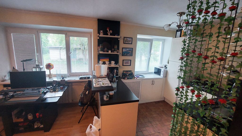 гостиная: кухонный гарнитур, диван, стол (трансформер), складные стулья (4 шт), барная стойка и два барных стула, стиральная машина, микроволновка, холодильник, газовая встроенная панель, посудомоечная машина, телевизор, биокамин, WiFi poутер;