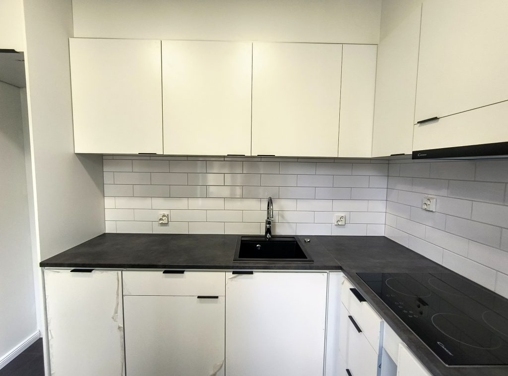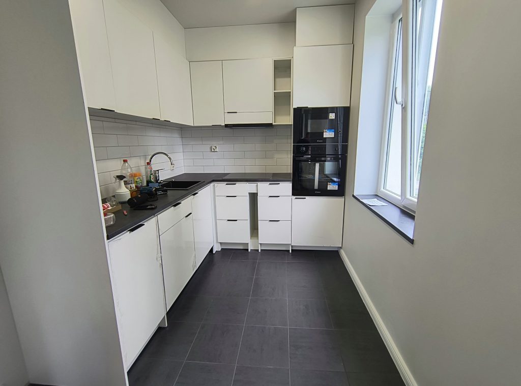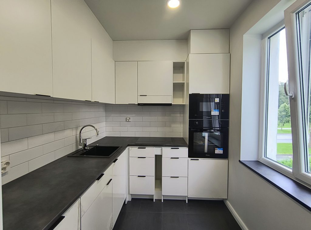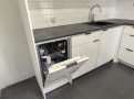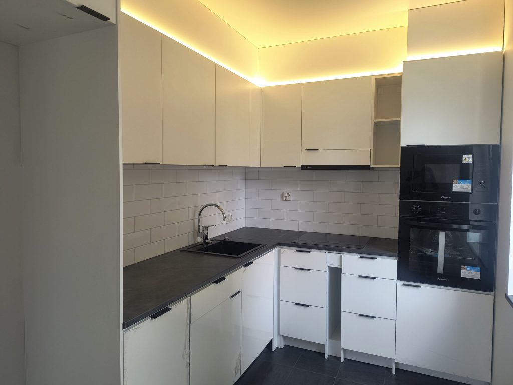 Кухня: открытая планировка, индукционная плита, встроенная посудомоечная машина, встроенные микроволновая печь и духовой шкаф