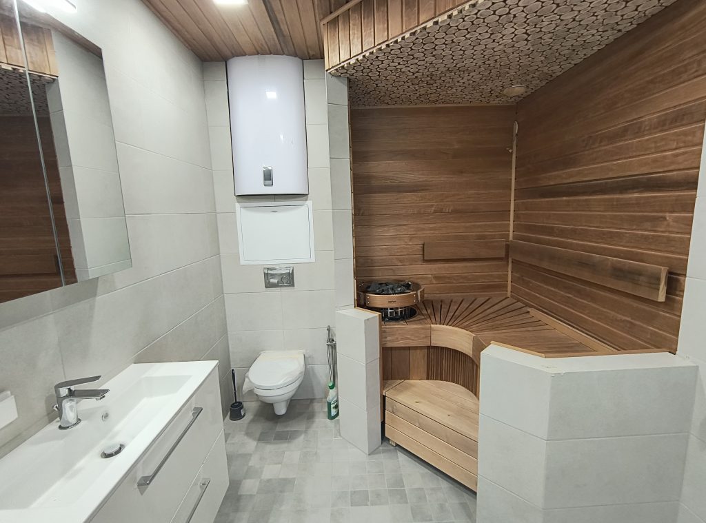 Сауна: Электропечь Harvia Cilindro PC90, термоосина (стены в сауне и потолок в ванной комнате), потолок в сауне из можжевельника, заказаны стеклянные двери