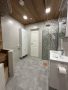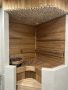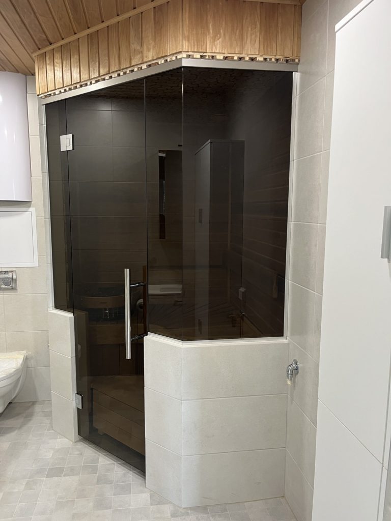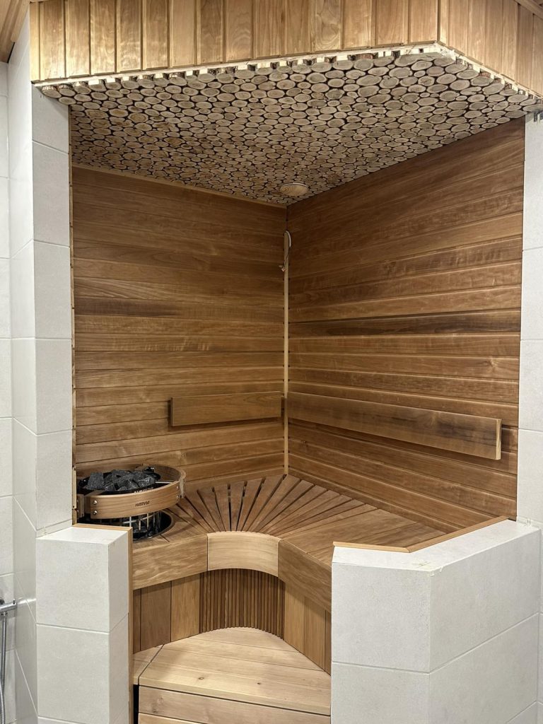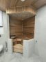 Сауна: Электропечь Harvia Cilindro PC90, термоосина (стены в сауне и потолок в ванной комнате), потолок в сауне из можжевельника, заказаны стеклянные двери