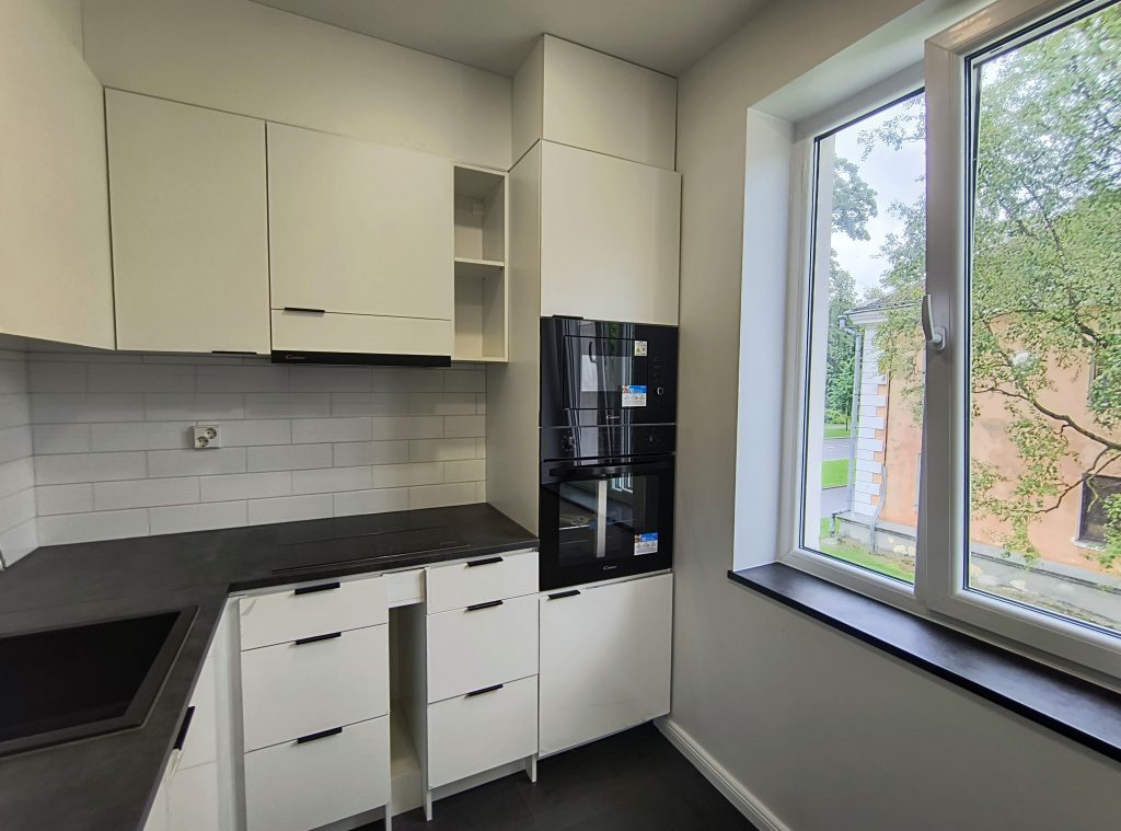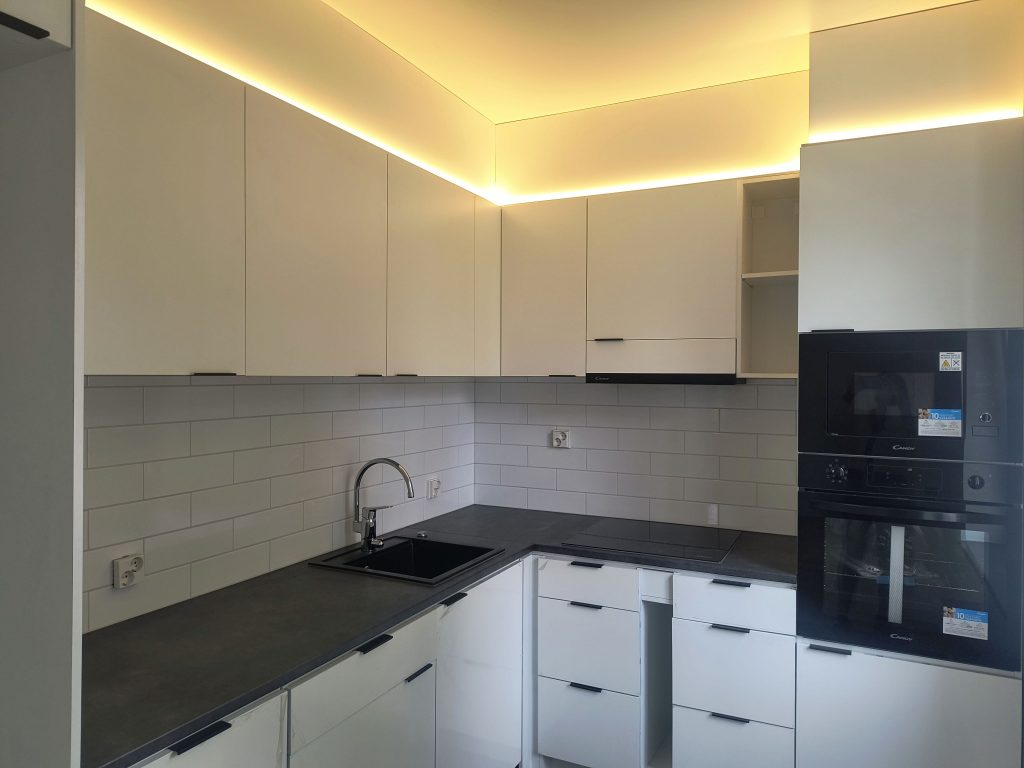 Кухня: открытая планировка, индукционная плита, встроенная посудомоечная машина, встроенные микроволновая печь и духовой шкаф