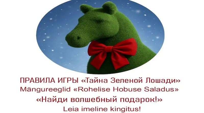 Molodoi.ee будет размещаться ЗАГАДКА от Зелёной Лошадки, в которой зашифрована ЛОКАЦИЯ в г.Силламяэ, где спрятан ПОДАРОЧНЫЙ БИЛЕТ. Задача ИГРОКА первому найти спрятанный подарочный билет и обменять его на ВОЛШЕБНЫЙ ПОДАРОК.