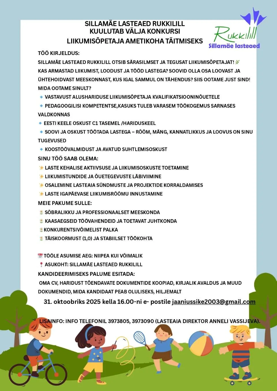 Sillamäe lasteaed Rukkilill kuulutab välja konkursi liikumisõpetaja ametikoha täitmiseks