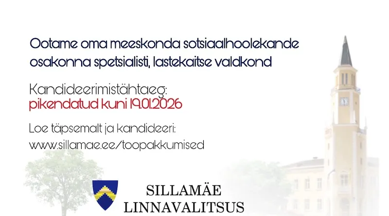 Sillamäe Linnavalitsus otsib oma meeskonda sotsiaalhoolekande osakonna spetsialisti (lastekaitse valdkond). Kandideerimistähtaeg on pikendatud kuni 19. jaanuarini 2026.