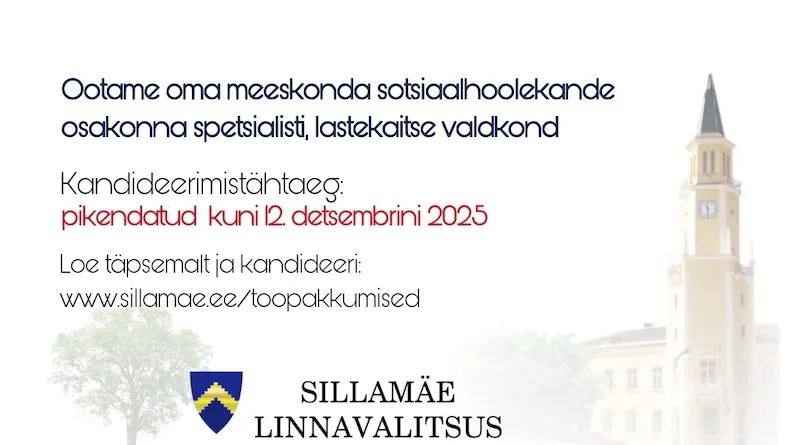 Ootame Sinu CV-d, haridust tõendavat dokumenti, motivatsioonikirja koos palgasooviga ning väljavõte karistusregistrist hiljemalt 12. detsembriks 2025. a e-posti aadressile margarita.maiste@sillamae.ee märksõnaga “Sotsiaalhoolekande osakonna spetsialist (lastekaitse valdkond)“.